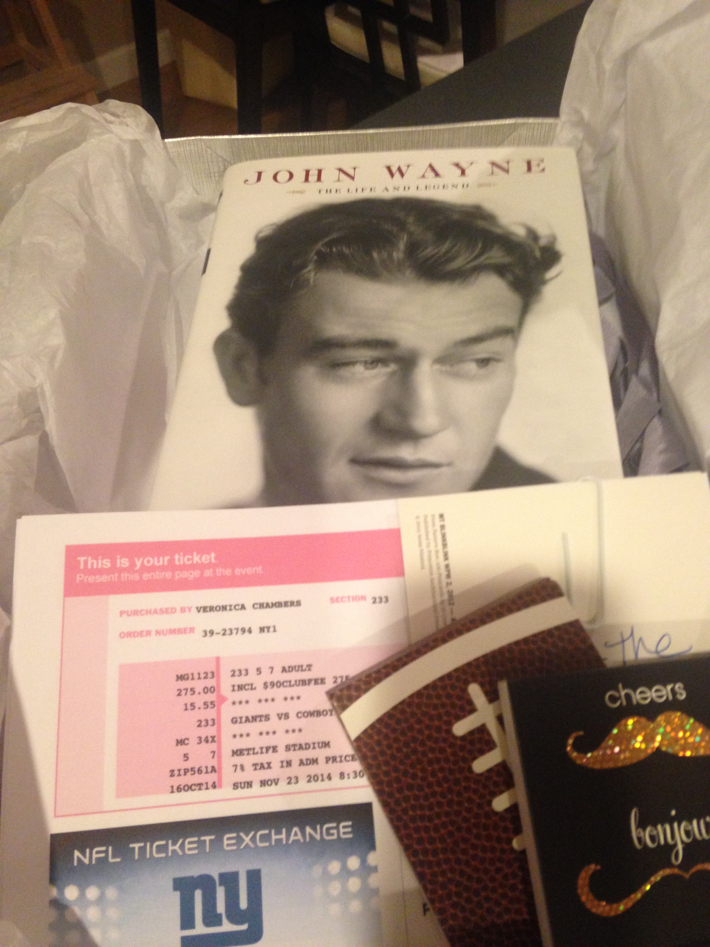 One of my favorite things to do is to combine lots of small gifts into a themed box. So for this gift, I started with a signed edition of Scott Eyman’s John Wayne biography. Then I added two tickets to a New York Giants vs Dallas Cowboys game. Then I filled it out with little things like notepads with fun covers. So the theme was “Giants and Cowboys.” The Cowboys won the game, but the gift was a giant hit. (Thanks. I’ll be here all week.)